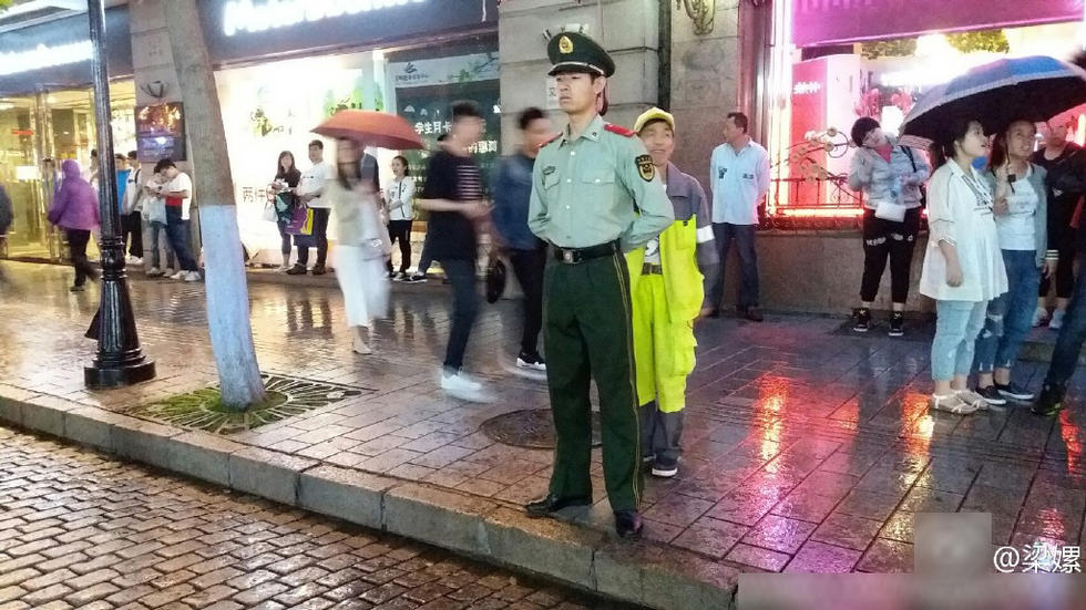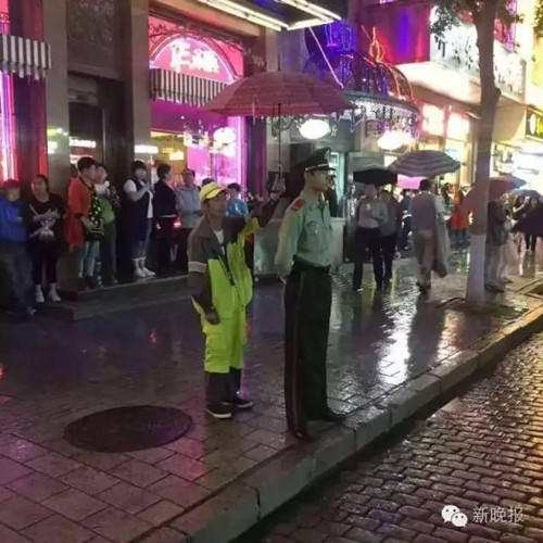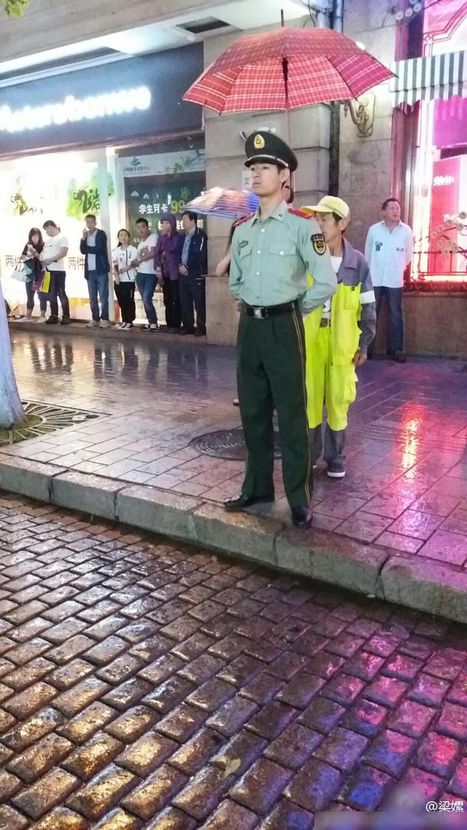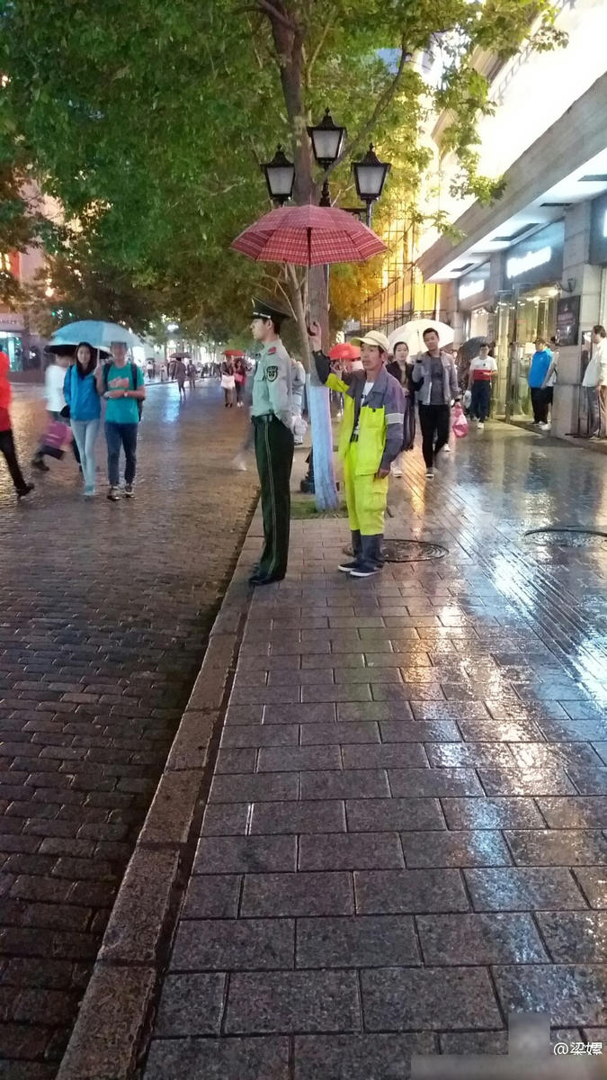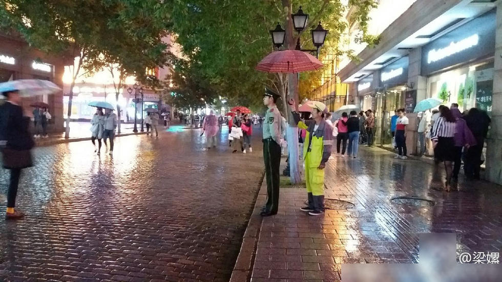 6月10日晚上,哈尔滨的一场大雨让人猝不及防,大雨很快停歇,一张照片却在很多人的朋友圈里流传开来。这张照片,拍摄地点是在哈尔滨中央大街上,一名武警战士在路边站岗时,突然降下大雨。行人们纷纷避雨或撑起雨具,这时一名环卫工人,出现在了武警战士的身后,伸长手臂,把雨伞打在了他的头顶。拍摄照片的高德峰说,当时他刚好路过这里,看到了这一幕。图:新晚报