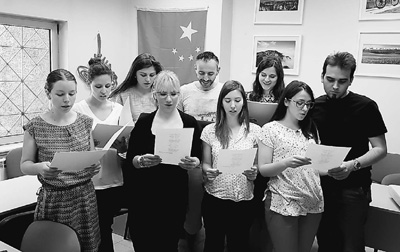 塞尔维亚约翰·奈斯比特大学中国中心的学生利用课余时间排练合唱节目,准备欢迎习近平主席来访。