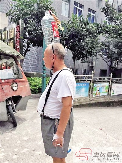 拍下这组图片的网友@“一船月光摇啊摇”说:7月9日,我在杨家坪建设医院遇见了一位“牛伯”,因为要照看三轮车里瘫痪的妻子,腾不出身,他用一个大桶将输液袋顶在头顶。