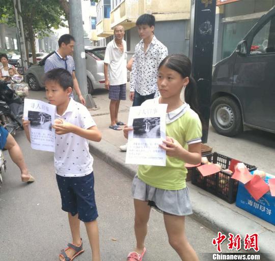 陈国西11岁的女儿和表弟向路人展示寻人启事。 韩章云 摄