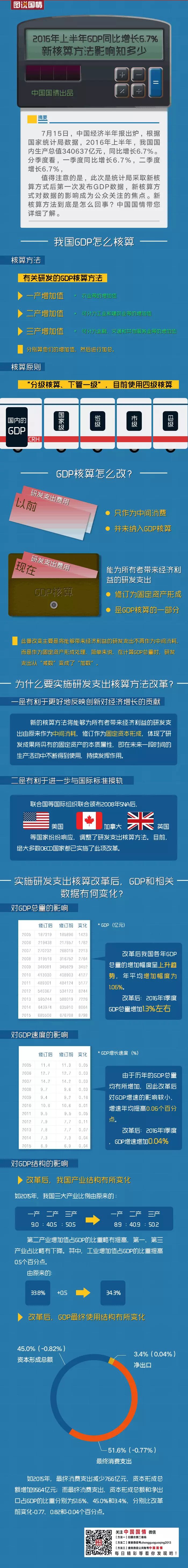 7月15日,中国经济半年报出炉,根据国家统计局数据,2016年上半年,我国国内生产总值340637亿元,同比增长6.7%。分季度看,一季度同比增长6.7%,二季度增长6.7%。值得注意的是,此次是统计局采取新核算方式后第一次发布GDP数据,新核算方式对数据的影响成为公众关注的焦点。