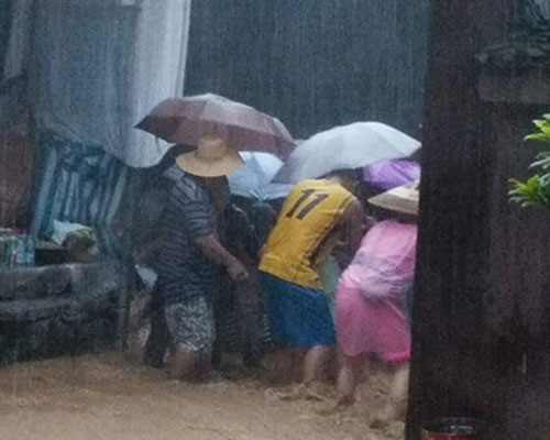 眼看着水位越来越高,热心的当地村民将游客接到家中,有的拿出干衣服,有的拿出粽子、鸡蛋……暴风雨中的苗寨生起了一团团温暖的火焰。