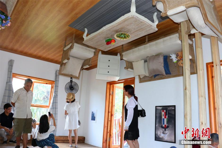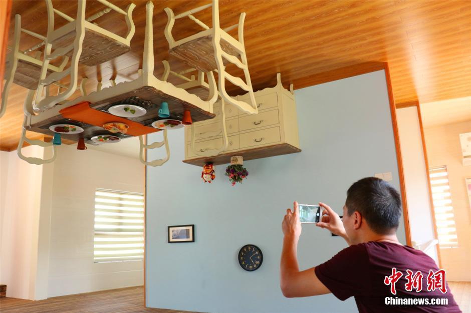 7月19日,浙江省奉化市溪口镇现倒置别墅。走进别墅内是一番奇异场景,屋内所有设施像被吸到了屋顶,呈倒置分布,越向前走,失重感越强烈。 中新社记者 何蒋勇 摄