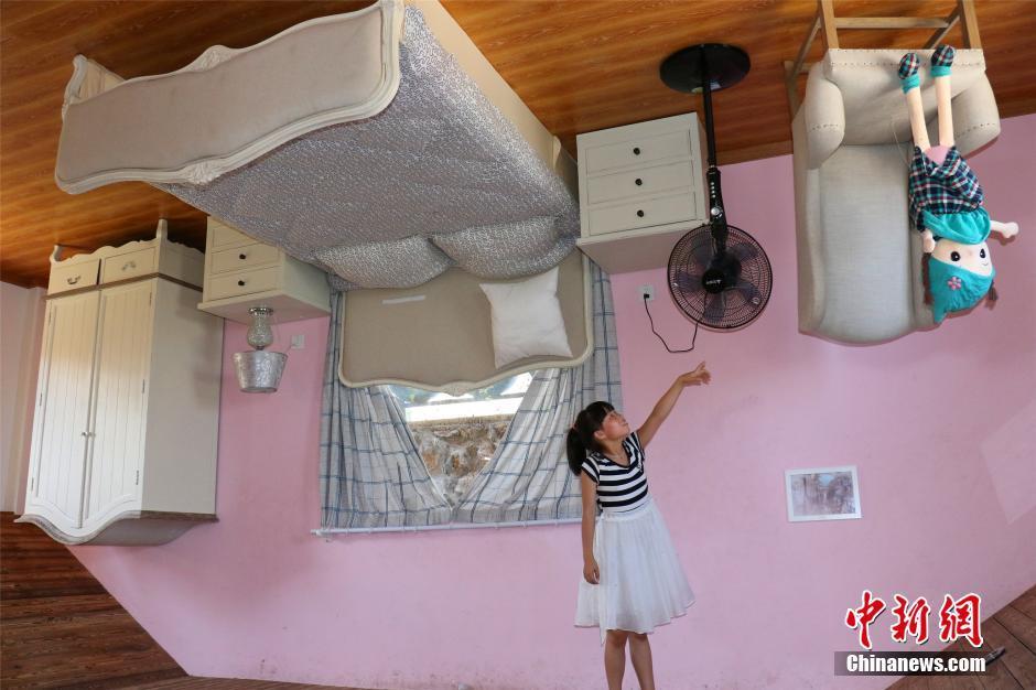 别墅内卧室倒置,小朋友感受乾坤颠倒的奇妙之感。 中新社记者 何蒋勇 摄