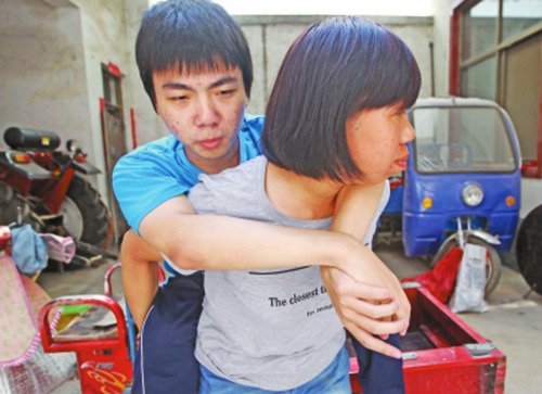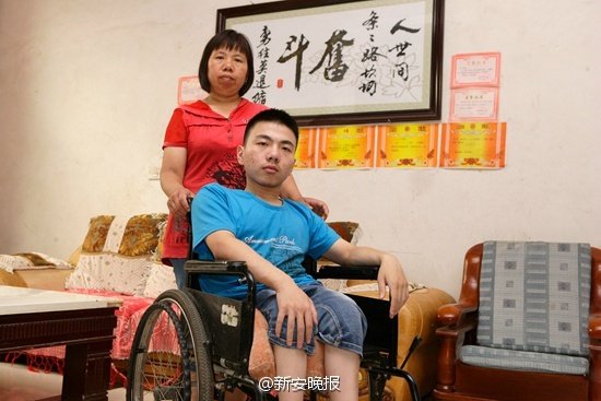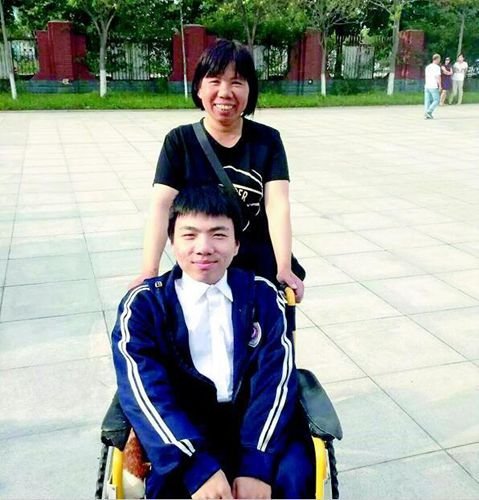 朱志强刚出生就患先天性脊膜膨出,下半身瘫痪。14年来,母亲边辛苦打工维持生计边陪读,身高不足1.6米的她每天背儿子上下学。
