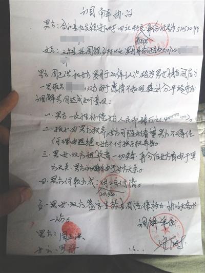 8月2日上午,周正洪家所在的九支镇安居村委会对此事进行了调解,双方达成了调解协议。协议称,男方周正洪和女方罗丹于2013年认识,结为男 女朋友同居,生有一男。双方由于感情不好现提议分手,经调解达成如下意见:一、男方一次性补偿女方4万元;二、孩子由男方抚养,女方可随时看望,男方不得 以任何理由拒绝,女方不付孩子抚养费;三、男女双方脱离一切关系。