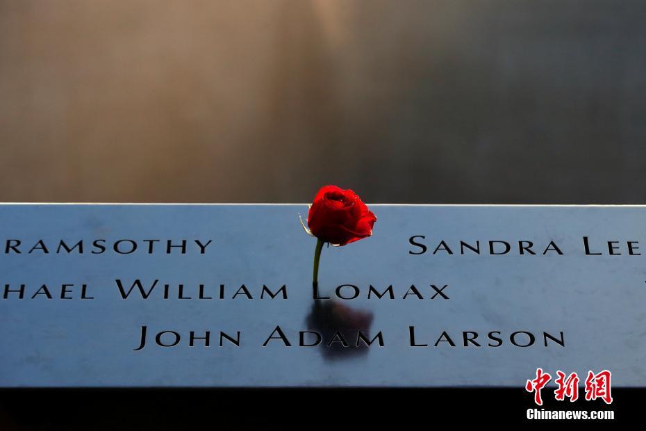 当地时间2016年9月9日,美国纽约,当地民众举行“9·11”事件15周年纪念活动。图为一支玫瑰插在纪念石碑上。