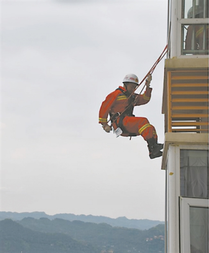 重庆商报讯 昨日,丰都县丰城尚座小区1单元17楼一处窗台上,一女子通过微信朋友圈直播自己割腕并爬上17楼窗台欲轻生的视频。接警后,丰都消防平都中队8名官兵驱车赶往现场,索降破门同时进行,成功救下轻生女子。