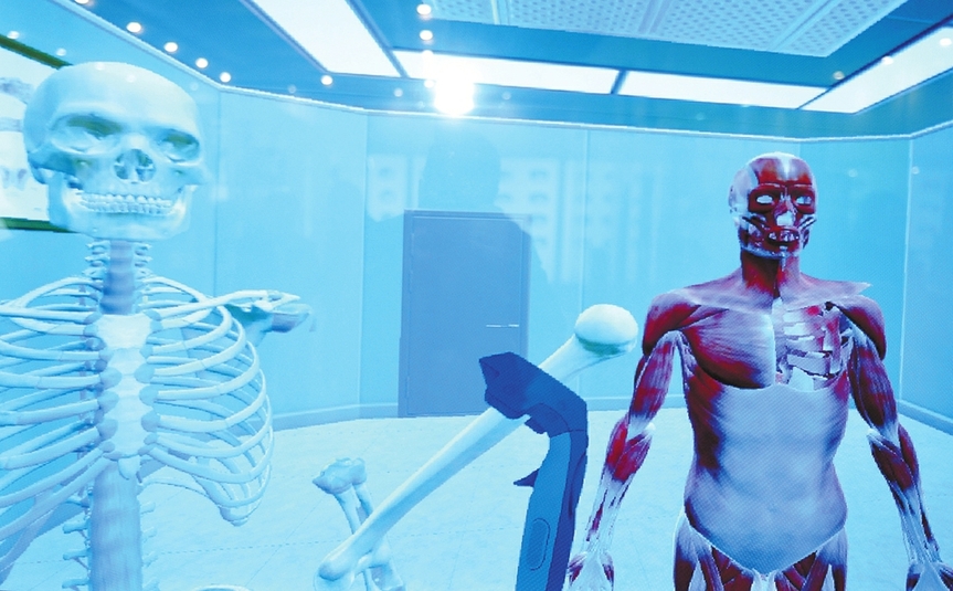 一名穿着白大褂,戴着VR的学生正站在屏幕前,老师在一旁进行讲解。这是四川大学华西基础医学与法医学院的师生正在上“模拟解剖课”,学生可以凭借VR全方位立体地观察屏幕中人体的各个器官和结构,连血管都一目了然。学生甚至可以把器官“拿到”自己面前近距离观察,学习结束后通过一键复原让器官回到原位,学生置身在一个真实的场景中,所有的器官,就连皮肤都是真真切切的。