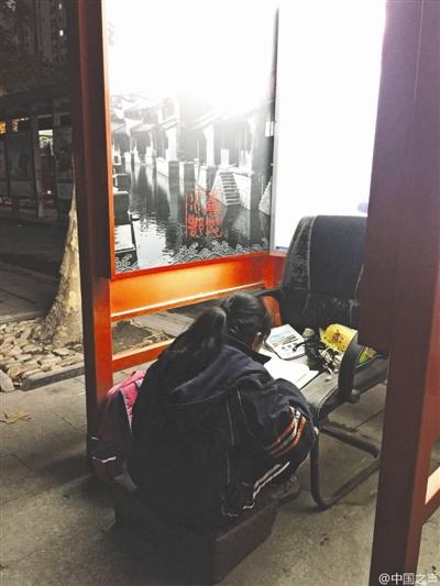 浙江嘉兴市中医院附近,12岁女孩陈晓华每天放学后都会出现在父母清扫的路段,在路边的电话亭内做作业,这已经持续4年多了