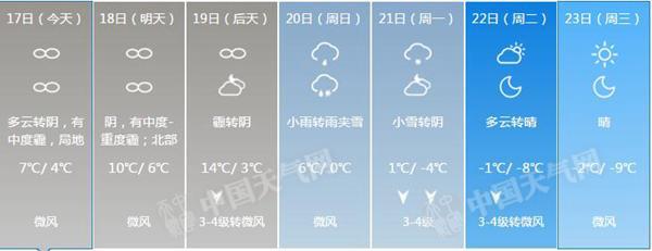 北京市气象台11时发布天气预报,今天下午阴天间多云,有中度霾,局地重度霾,南风二级左右,最高气温7℃;夜间阴,有中度到重度霾,并有雾,南转北风一二级,最低气温4℃。郭建兴提醒,今天白天,北京的光照条件明显比昨天差,最高气温将比昨天下降3℃到4℃,加上空气湿度增大,人体感觉会比较冷,提醒大家今天下班放学时要注意保暖。