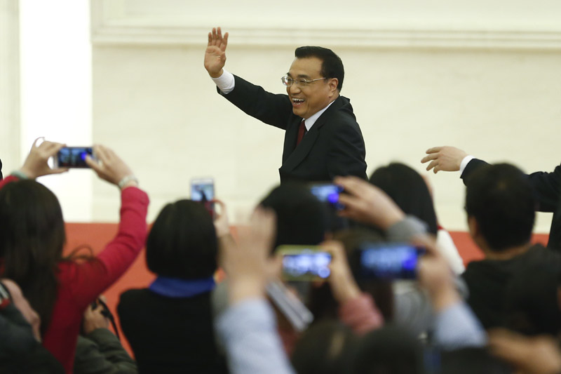 2016年3月16日上午,十二届全国人大四次会议闭幕后,国务院总理李克强在人民大会堂三楼金色大厅会见采访十二届全国人大四次会议的中外记者并回答记者提出的问题。(资料图)