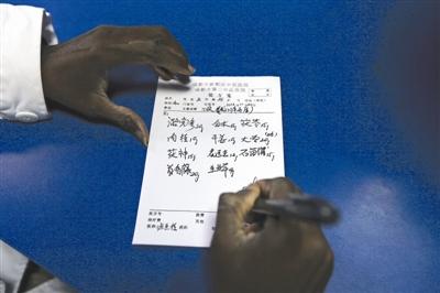 病房中浓浓的草药香气,病人吴刚侧躺在病床上,安静踏实地任由医生将加热的针,刺在腰椎的穴位上。镜头聚焦到那双扎针的熟练的手,白大褂袖子的袖口,露出的,是一双黝黑的手。再来仔细端详这位医生,肤色黝黑,戴着眼镜,这位中医竟是位黑人。