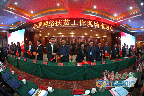 会议还开通了国家贫困县名优特产品网络博览会平台,启动了网络扶贫“双百”项目,国家发展改革委、中国农业发展银行与江西省政府签署了网络扶贫合作框架协议。京东、阿里、腾讯、百度、去哪儿、最美我村、沪江教育、春雨医生、诚成资本、好未来、国安社区、美团、易华录、匡恩网络、供销e家、乐村淘、航天数字、亚信等网信企业与赣州市、吉安市、宁都县等18个市区县签署了结对帮扶协议。