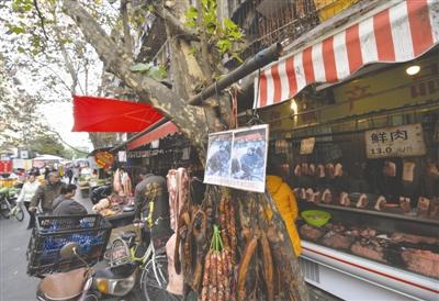 昨日,西体路,一家肉铺挂出一张截屏照片,店铺员工说照片里的人偷了店里的鸭子。