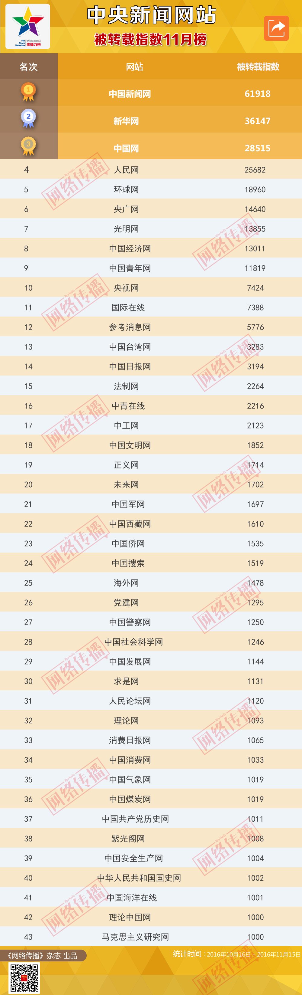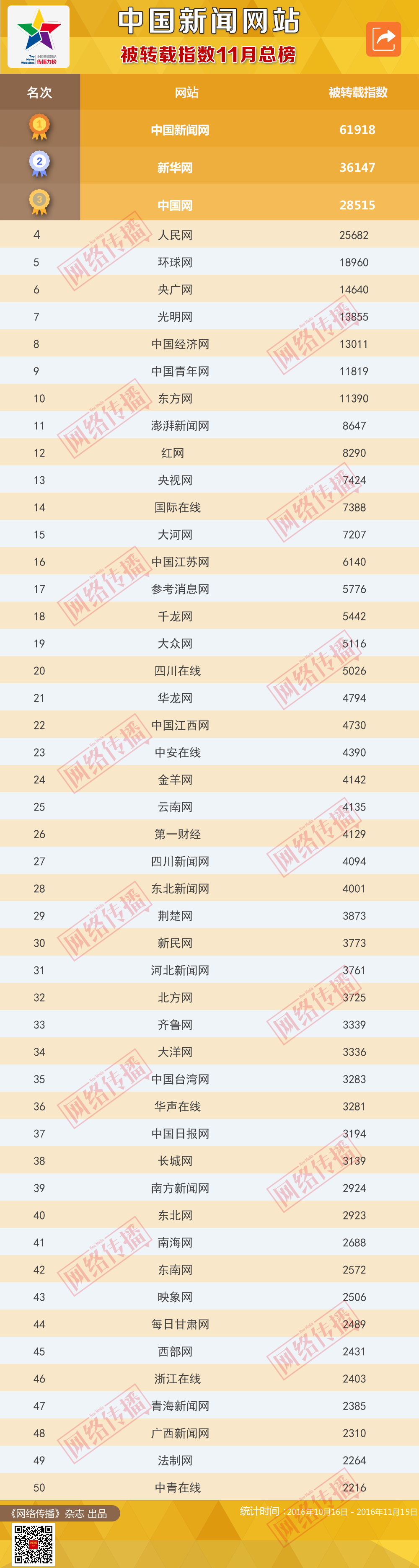 中央网信办《网络传播》杂志倾力打造的“新闻网站被转载指数2016年11月榜”今日正式发布。