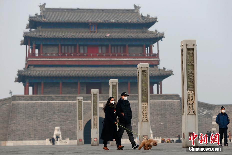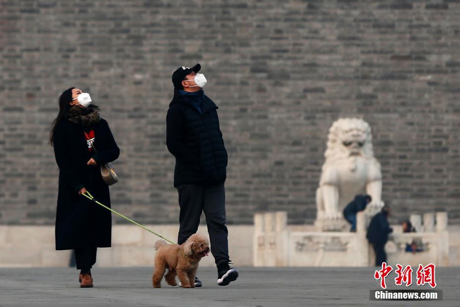 北京民众戴防雾霾口罩遛狗。中新社记者 富田 摄