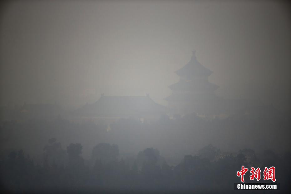 12月17日,北京天坛祈年殿在雾霾笼罩下若隐若现。自12月16日20时至21日24时,北京启动空气重污染红色预警。 中新社记者 富田 摄