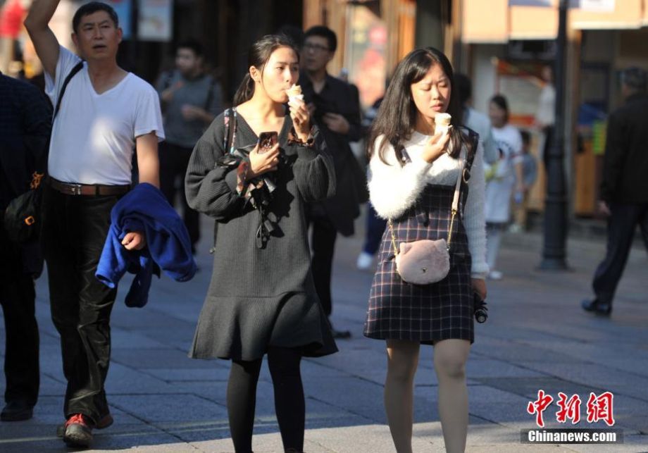 市民边吃冰激凌边逛街。 中新社记者 张斌 摄