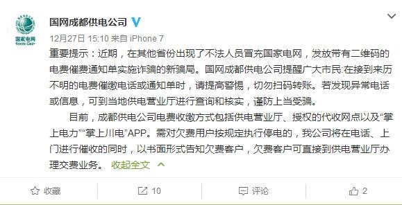 四川在线消息:12月27日,国网四川省电力公司成都供电公司官方微博发布重要提示,该提示称:近期,在其他省份出现了不法人员冒充国家电网,发放带有二维码的电费催费通知单实施诈骗的新骗局。