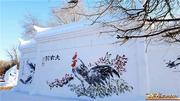 雪博会上,作在雪墙上的大吉图。(焦洋 摄)