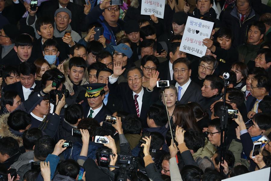 1月12日,在韩国首尔火车站,联合国前秘书长潘基文(中)被民众簇拥。联合国前秘书长潘基文当日下午飞抵韩国。他说目前还无法就是否参加韩国总统选举表态。 新华社发(李相浩摄)