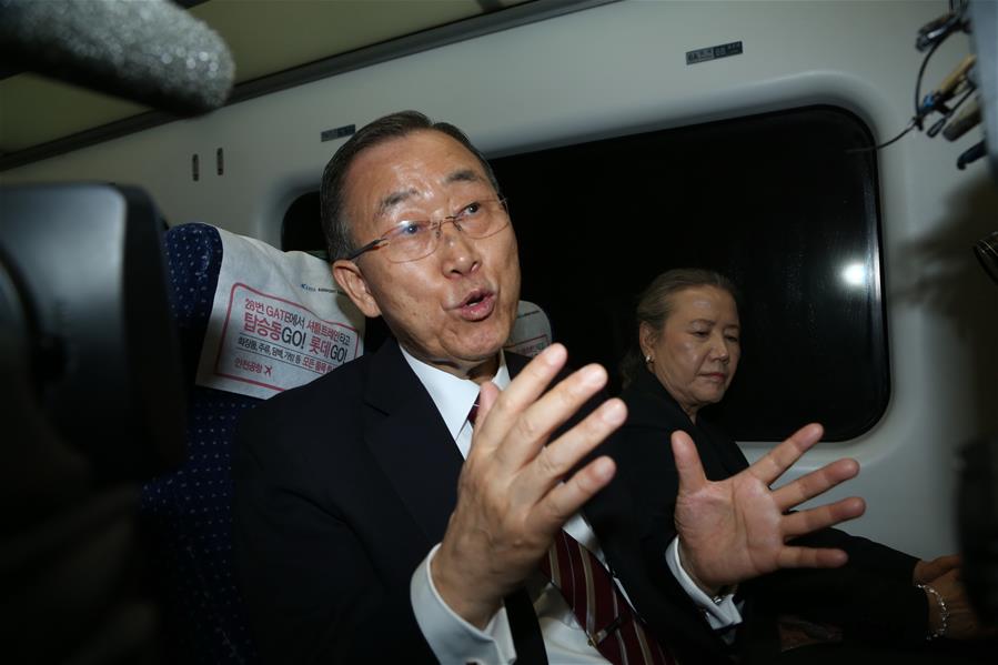 1月12日,在韩国仁川国际机场,联合国前秘书长潘基文在前往首尔火车站的机场快轨上对记者讲话。联合国前秘书长潘基文当日下午飞抵韩国。他说目前还无法就是否参加韩国总统选举表态。 新华社发(李相浩摄)