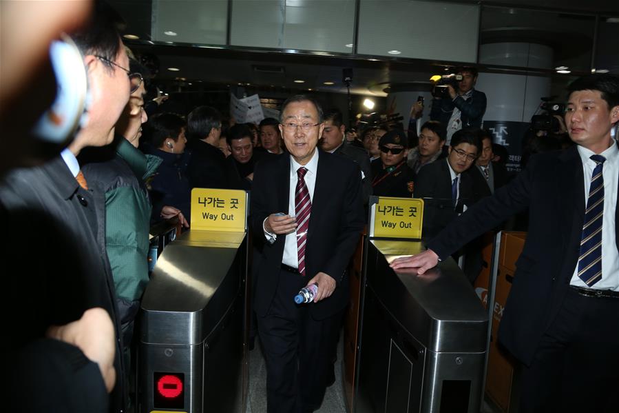 1月12日,在韩国仁川国际机场,联合国前秘书长潘基文(中)通过机场快轨的自动检票口。联合国前秘书长潘基文当日下午飞抵韩国。他说目前还无法就是否参加韩国总统选举表态。 新华社发(李相浩摄)