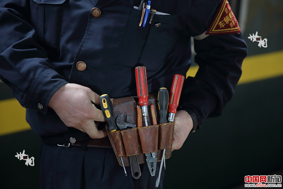 发电车乘务员将工具挂在身上。