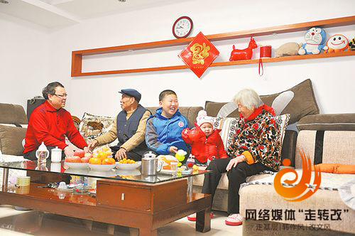 曹正富一家在新房里畅谈新生活。