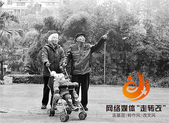 曹正富和老伴推着小孙女在小区里散步。