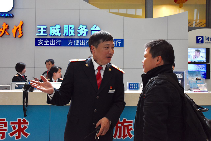 福州南站党总支书记王威在为旅客指路。中国网信网 陈舞阳摄