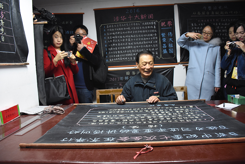 黄以孟在自己的“编辑部”里展示他的黑板报。中国网信网 陈舞阳摄