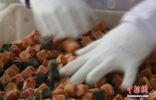 稻香村工人查看元宵馅料。 中新社记者 杨可佳 摄