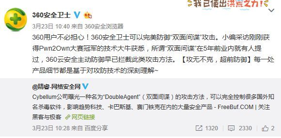 3月初,“维基解密”曝光了CIA企图利用病毒绕过360、卡巴斯基、MSE等安全软件监控全球智能设备,却被360无情“打脸”:CIA的病毒和攻击手段早已过时,压根绕不过360这一关。现在,一个并不新鲜的“双面间谍”让国外杀软陷入慌乱,却同样倒在了360的脚下。由此可见,在对付病毒攻击上,国内的安全产品依然值得信赖。