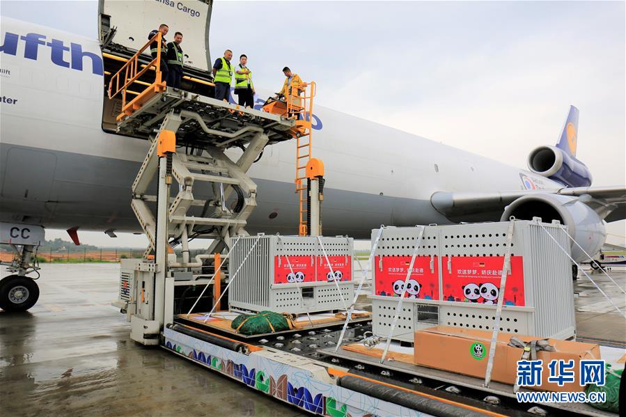 当日9时35分,赴德大熊猫“梦梦”“娇庆”搭乘货运航班离开家乡成都,动身前往德国柏林动物园。在那里,它们将生活15年,参与中德科学家的大熊猫科研保护国际合作。