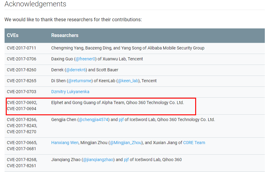 图1:7月6日的谷歌安全公告中,360手机卫士阿尔法团队贡献了两个漏洞