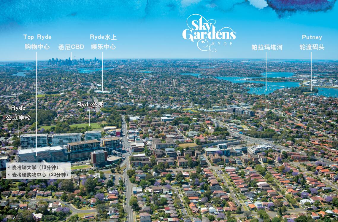 Sky Gardens坐落于澳洲第三大历史悠久的城区——悉尼Ryde区,这里距悉尼CBD仅约12公里,距Parramatta CBD仅约8公里,享受着两大中心区的商业、生活配套、交通、教育资源的同时,Ryde区素有“悉尼最安全的地区之一”的声誉。