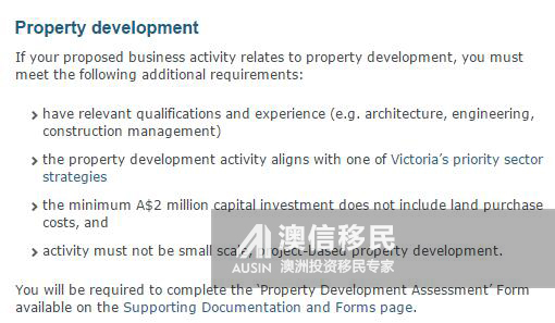 澳信移民专家分析,近年来,维州房地产市场非常活跃,投资前景良好。132签证的申请人如果想在维州开发房地产,必须具备良好的资质与经验,适合本来就在国内从事房地产业务的投资人。此外,房地产开发项目对资金的要求较高,投资人需要准备充裕的资金。