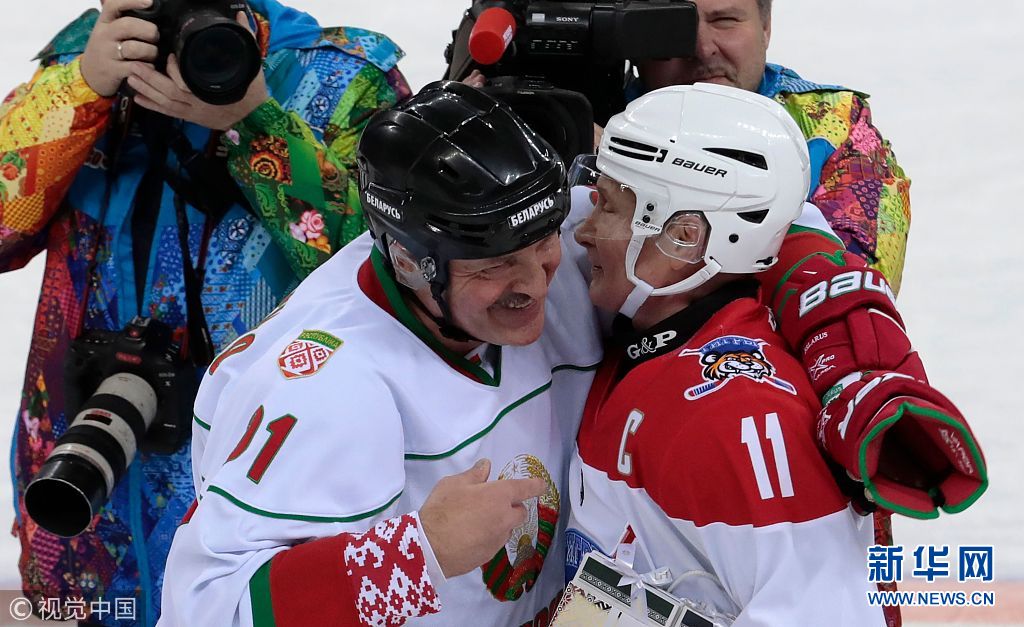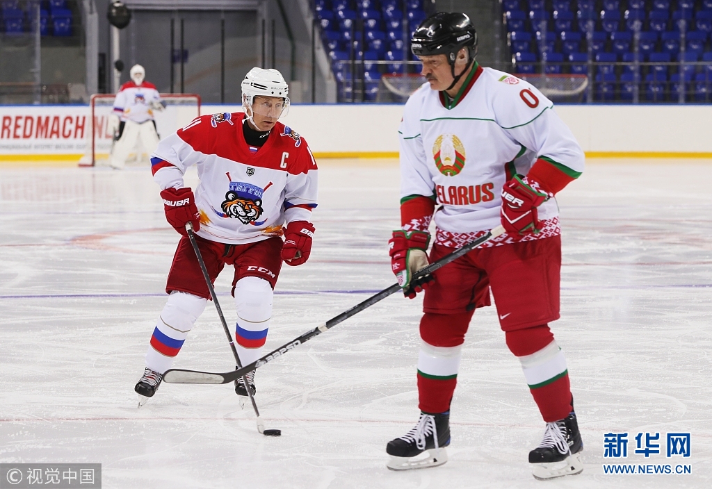 普京、卢卡申科现身冰球场同场竞技 场上比拼球技场下拥抱寒暄