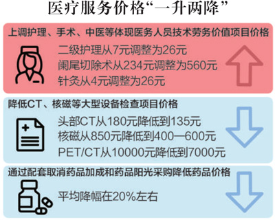 北京启动医药分开综合改革,取消挂号费、诊疗费,取消药品加成,设立医事服务费,435项医疗服务价格将规范调整。此次价格调整具体为“一升两降”,重点提高了床位、护理、注射、中医、手术等项目价格,降低了CT、核磁等大型仪器设备检查项目价格。改革后全市医疗费用总量上基本平衡,患者费用负担总体没有增加。