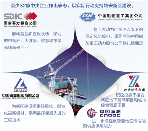截至目前,已有至少32家中央企业表态,以实际行动支持雄安新区建设。包括国投公司、中国中铁、中国联通、东方航空、南方电网等央企结合自身业务特点,制定了相应的发展策划,展开前瞻性研究,推进建设服务新区的相关工作。