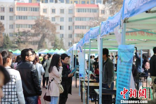 中新网兰州4月14日电 (记者 刘玉桃)13日,兰州交通大学2017年春季毕业生双选会暨甘肃省战略性新兴产业骨干企业招聘会于兰州举行,200多家企业提供5000多个就业岗位,来自甘肃各高校近万名大学生入场求职。
