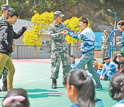 4月14日,教官教学生们近身防身术动作。在全民国家安全教育日来临之际,部队官兵为江西省南昌市湾里区梅岭学校的学生们上了一堂生动的国家安全教育课。部队官兵通过讲解国家安全知识、教授近身防身术等方式,向学生们普及国防科学知识,提高国家安全意识。新华社记者 万 象摄
