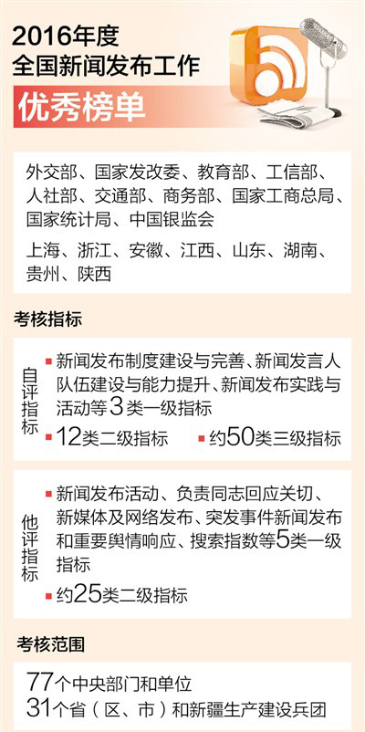 日前,国务院新闻办公室完成了对77个中央部门和单位、31个省(区、市)和新疆生产建设兵团2016年新闻发布工作的评估考核,本报记者采访国新办相关负责人和业内专家,关注评估考核结果,探讨例行新闻发布制度的设立和完善。