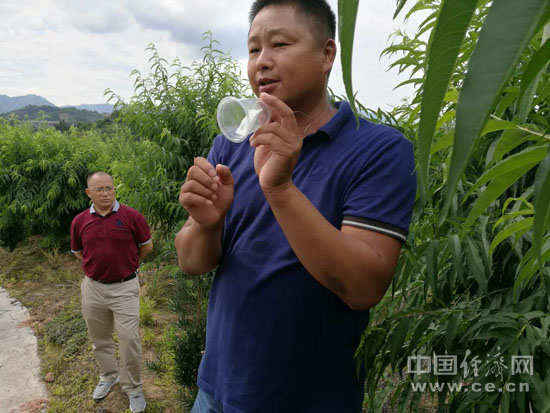 镇岗乡黄洞村鹰嘴桃扶贫基地的谢富泉向记者展示常用的物理驱虫方法。盒子里的物体有特殊气味,能把虫子“熏”走。中国经济网记者 范戴芫/摄