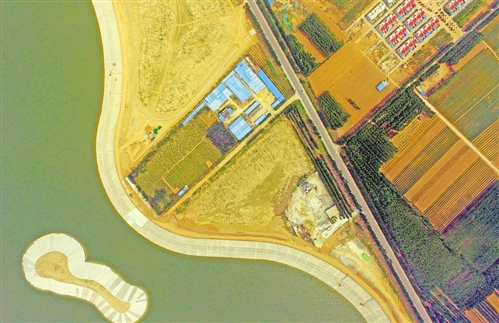 6月15日航拍的山东聊城市茌平县贾寨镇正在蓄水的东邢湖水库。南水北调工程东线一期工程茌平县续建配套工程自2016年1月份开工,目前主体工程已完工,东邢湖水库已蓄水260万立方米。 赵玉国摄