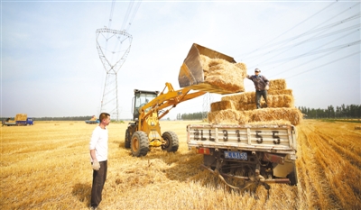 “三夏”时节,河北不少地方的农民回收麦秸,卖给奶牛场制作饲料。这样不仅避免了焚烧秸秆污染空气,还给农户带来了收入。图为6月15日,在河北省永清县李家口村,农民将压成块的麦秸装车回收。