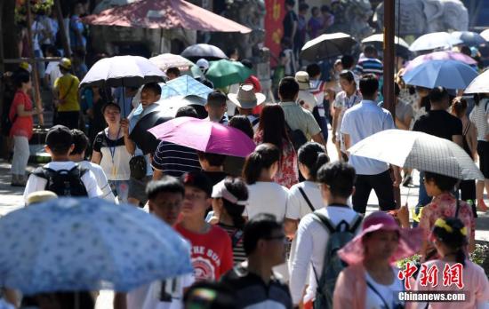 厦门一景点游客们纷纷打伞遮挡烈日。张斌 摄