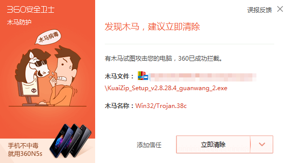 360安全卫士对软件升级劫持“投毒”进行拦截查杀。